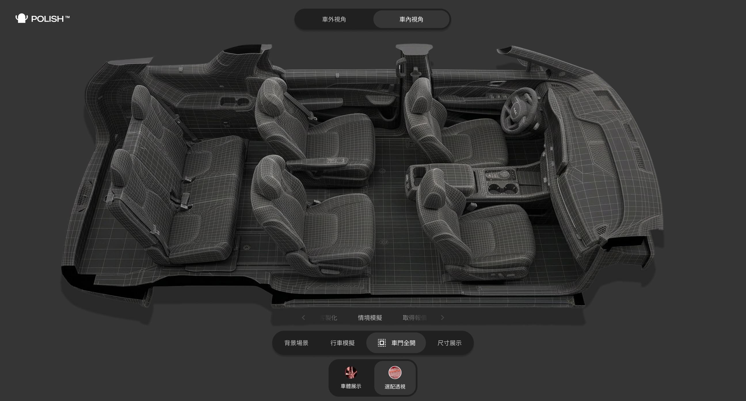 Polish Design 還做過 線上改裝車款網站。使用者可以在網頁上即時更換車輛的顏色、輪框、內裝配置,每一次更換都即時渲染出 3D 效果。